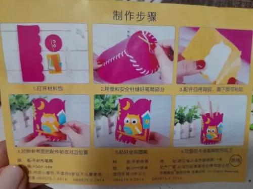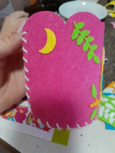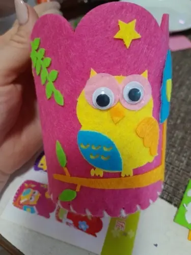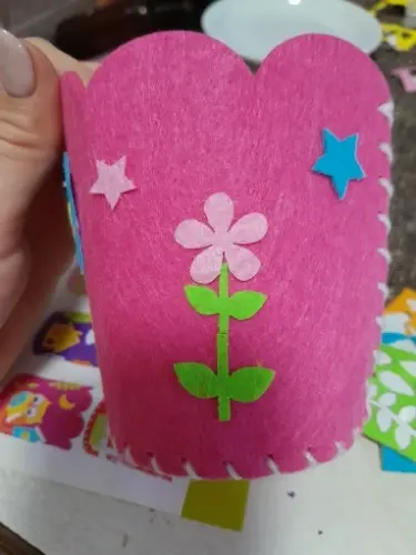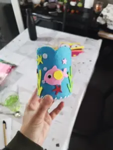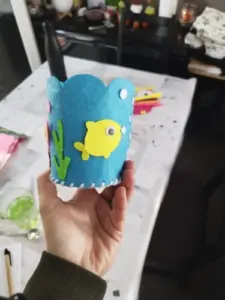 We store pencils, brushes, markers, and scissors in this glass.